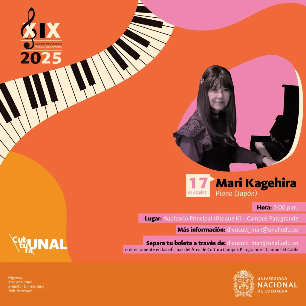 La pianista Mari Kagehira, nacida en Osaka (Japón), inició su formación musical a los tres años bajo la guía de reconocidos maestros en su país natal. Posteriormente, amplió sus estudios en Europa y América Latina, obteniendo el título de Magíster en Interpretación y Pedagogía Instrumental en la Universidad Nacional de Colombia.